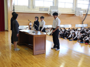 山梨県立山梨高等学校 > 生徒会活動 > 生徒会行事 2024年5月2日カテゴリー: 生徒会活動 生徒会行事 5月2日(木)にHR役員認証式が行われました。各クラスの委員長、副委員長の名前が呼ばれ、各学年の代表者に認証状が授与されました。 委員長、副委員長のリーダーシップにより、仲間をまとめ、個性のあるクラスを作ってください。 その後に行われた第1回生徒総会では、決算や予算、梨窓祭の内容などについての提案が承認されました。 一人ひとりがきまりやマナーを守りながらみんなで協力して梨窓祭の準備をしていくことが確認されました。 生徒総会終了後には、県高校総合体育大会の壮行会が行われました。 吹奏楽部の伴奏による入場行進や選手宣誓に続いてエールも贈られ、選手たちは今までの練習の成果を発揮することを誓っていました。 活躍を期待しています。