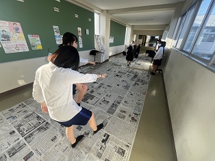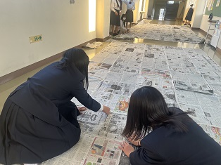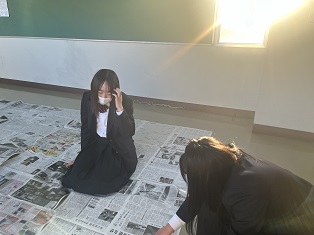 山梨県立山梨高等学校 > 生徒会活動 > 部活動 > 書道 > 書道部活動 2024年5月16日カテゴリー: 部活動 生徒会活動 書道 書道部活動 放課後に書道部が活動していました。 書道パフォーマンスの本番は5分ほどですが、その前には書の練習はもちろん、用紙の準備にとても手間がかかります。 今日は6月の学園祭のための準備をしていました。新聞紙を何枚も重ねてテープで貼り付け、大きな用紙を作っていました。 これを何枚も作って練習用紙にすると言っていました。本番用の用紙も和紙で同じように作るという事です。2,3年生が1年生に作り方を教えていました。