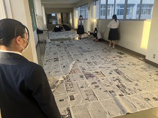 今日は6月の学園祭のための準備をしていました。新聞紙を何枚も重ねてテープで貼り付け、大きな用紙を作っていました。