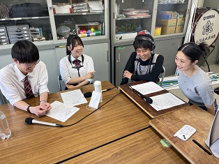 山梨県立山梨高等学校 > 生徒会活動 > 部活動 > 吹奏楽 > FM FUJI『みらいterminal』取材 2024年5月20日カテゴリー: 部活動 生徒会活動 吹奏楽 FM FUJI『みらいterminal』取材 NEW GENERATIONの活躍を紹介するFM FUJIのラジオ番組『みらいterminal』の取材がありました。 今回は吹奏楽部の3年生の遠藤さんと伊藤君が話を普段の活動の様子や目標などを紹介しました。 DJの柴田さんは生徒たちと年齢が近いお姉さんのような雰囲気で共感してもらえる部分が多く会話が弾みました。 オンエアは2024/05/24(金)18:45~18:53の予定です。