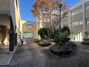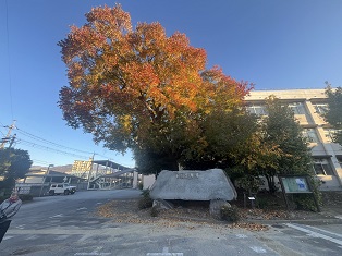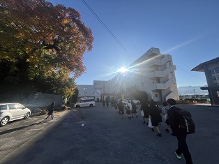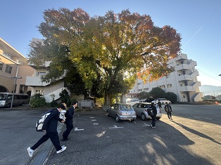 校舎正面のナンキンハゼは紅葉が一気に進み、青空と朝日に輝いてとてもきれいです。