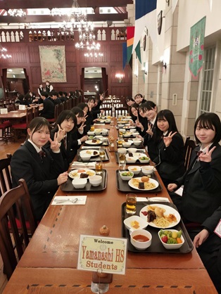 山梨県立山梨高等学校 > 学校から > ブリティッシュヒルズ語学研修① 2025年3月19日カテゴリー: 学校から ブリティッシュヒルズ語学研修① 3月18日(火)から3日間の日程で福島県の「ブリティッシュヒルズ」で語学研修が実施されており、15名の生徒が参加しています。 朝7時に学校を出発して途中那須高原SAで休憩し、14:00頃に到着しました。 パスポートコントロールの後、授業が始まりました。 「Survival English」では日常生活で使える英語をインタビューやボードゲームをしながら学びました。 夕食会場は、まさにハリーポッターのような世界になっていて、とても感動していました。 また、パブにも行き、英語でドリンクを注文して楽しく過ごしました。