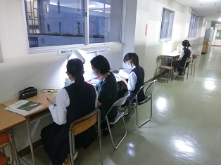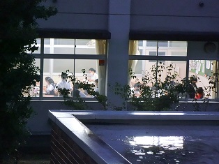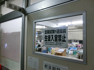 放課後に教室で勉強している生徒や、職員室前の質問コーナーで先生にわからないところを聞いている生徒がいます。頑張ってください。やったところが試験に出るといいですね。
