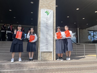 山梨高校から4名の生徒が参加しました。5月から各学校ごとに練習をして、全体で合わせたのは本番前の1回だけでしたが、本番では市長さんをはじめ、会場の方々にも口ずさんでいただき、明るい未来に向けた感動のステージでした。