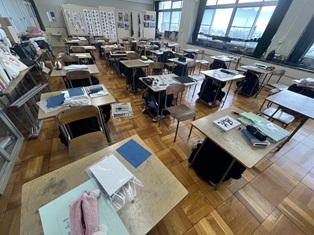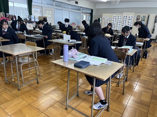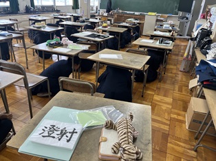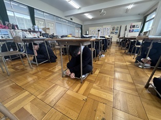 午前10時に訓練用の緊急地震速報が防災行政無線より流れると、授業中での教室では生徒はすぐに机の下に入り、頭を守る体勢をとりました。「姿勢を低く」、「頭を守る」、「動かない」が基本行動です。