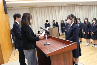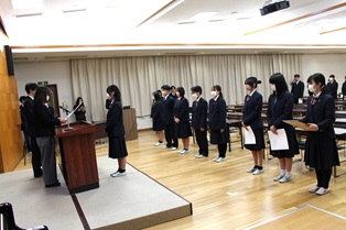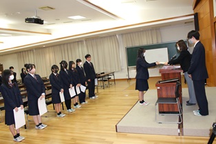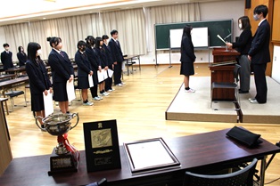 新人大会や芸術文化祭また、個人で入賞した作文やスピーチなどの生徒26名が賞状を納めました。