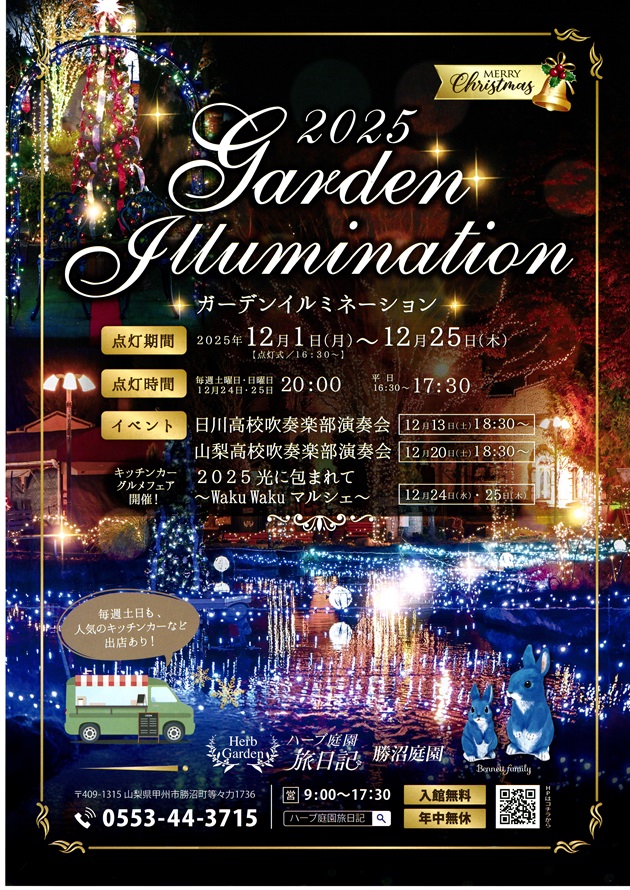 山梨県立山梨高等学校 > 生徒会活動 > 部活動 > 吹奏楽 > 吹奏楽部演奏会のお知らせ 2025年12月17日カテゴリー: 部活動 生徒会活動 吹奏楽 吹奏楽部演奏会のお知らせ 吹奏楽部は20日(土)の18:30より甲州市勝沼町のハーブ庭園旅日記「勝沼庭園」で約20分間のミニ演奏会を行います。 演奏にはOB・OGも加わる予定で、現在合奏の練習をしています。 きれいなクリスマスのイルミネーションの中での演奏できることをうれしく思います。 みなさん、暖かくして、ぜひ聞きに来てください。