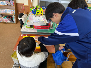 最初に吹奏楽部の演奏を聞いてもらいました。いろいろな楽器の形と音に興味を持ってもらうことができました。その後は室内でゲームや会話、外では鬼ごっこなどをして元気に遊びました。子どもたちも楽しんでくれてとてもうれしかったです。