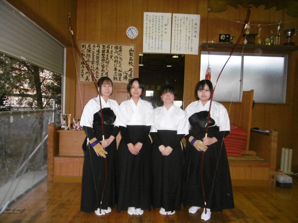 1月24日(土)に小瀬武道館弓道場で第25回東日本高校弓道大会山梨県予選が開催されました。女子団体2チーム、男子団体1チームが出場し、女子団体Aチームが3位となり、3月に茨城県水戸市で行われる東日本高校弓道大会への出場権を獲得しました。3位決定の競射は6本目までもつれ込みましたが、落ち着いて的に向かい、接戦を制しました。大会に向けて今後も精進していきたいと思います。
