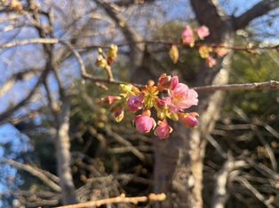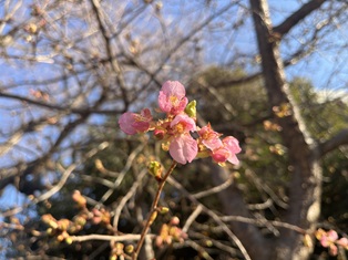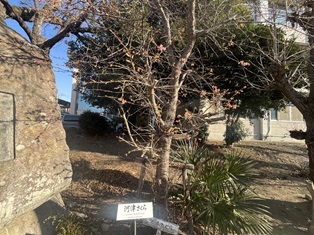 今朝、校歌碑横の「河津桜」を見ると数輪開花していました。