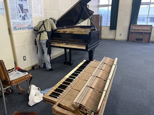 山梨県立山梨高等学校 > 学校から > 弦の交換 2026年3月27日カテゴリー: 学校から 弦の交換 今日は先日調律をしたときに発覚したピアノの弦の修理をしてもらいました。 今から69年も前に製造されたものなので、金属の弦が劣化して切れかかっていました。 古い弦を外し、メーカーに送って、同じ太さで巻き方が同じものを作ってもらったそうです。 交換作業も慎重に行っていました。古い製品なのでこれからも同じような不具合が出てくる恐れがあるそうです。大切にしていきたいと思います。