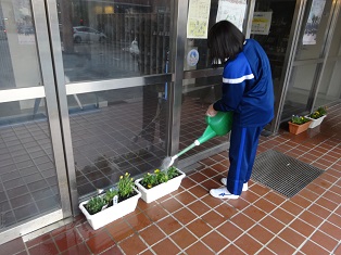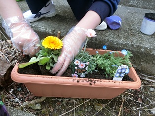 春の花の植え付けを行い、生徒昇降口に飾りました。