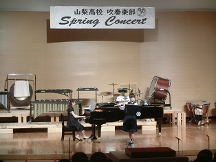 山梨県立山梨高等学校 > 生徒会活動 > 部活動 > 吹奏楽 > スプリングコンサート 2021年3月13日カテゴリー: 部活動 生徒会活動 吹奏楽 スプリングコンサート 3月13日(土)に山梨市の花かげホールで吹奏楽部の「スプリングコンサート」を開催しました。 3部編成で第1部は1,2年生のソロ演奏、第2部は今年の卒業生による発表、第3部はOB、OGを含めた全員での演奏でした。 演奏曲はゲームや昭和アイドル、お笑い、クラッシックなどから幅広い年齢の方々に楽しんでいただけるように選曲しました。 今回は新型コロナウイルスの影響で入場人数の制限をさせていただく中、ご来場できなかった多くの方々からも励ましや応援の声をいただき、感謝しています。特に3年生にとっては予想外の最後の1年でしたが、このコンサートが無事に実施でき満足しています。これからも部員一同元気に頑張りますので吹奏楽部をよろしくお願いいたします。