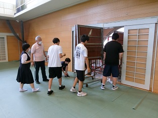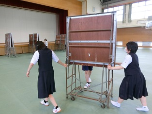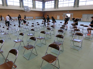 13日(日)にアリーナの準備を行いました。1学年分のイスを間隔が広くなるように並べました。