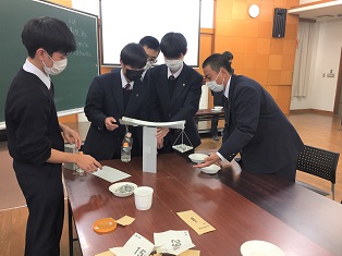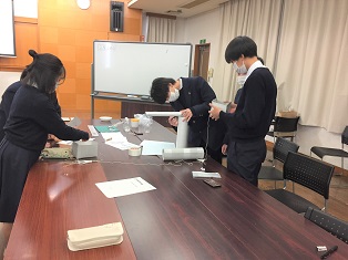 山梨県立山梨高等学校 > 学校から > 「科学の甲子園」山梨大会 2021年11月15日カテゴリー: 学校から 「科学の甲子園」山梨大会 11月14日(日)に「科学の甲子園」山梨大会が開催され、県内16校、39チームをオンラインで繋いで筆記試験と総合競技が実施されました。 山梨高校は2年生5人ずつの2チームが出場しました。 総合競技は厚紙やテープなどを使って「はかり」を作り、指定された重さの砂利を分ける問題でした。 短い制限時間内で工作と計量を行うためにはメンバーで仕事を分担することが重要でした。 500g近い重さの計量に耐えられる強度と精度を両立させるためにメンバーがアイデアを出し合い、難しさと同時に協力することの楽しさを味わうことができました。