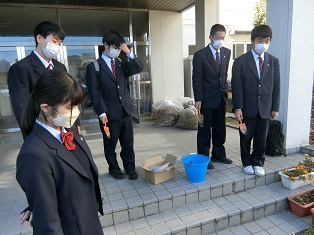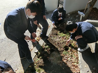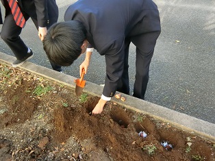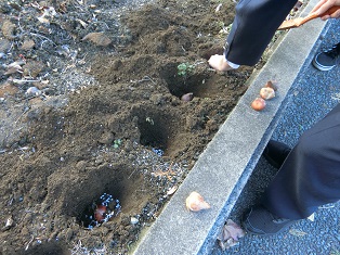 山梨県立山梨高等学校 > 学校から > チューリップの球根植え付け 2021年12月3日カテゴリー: 学校から チューリップの球根植え付け 日本教育公務員弘済会山梨支部による「花いっぱいになあれ」支援事業でいただいたチューリップの球根の植え付けを緑化推進委員会が行いました。 日当たりの良い花壇に穴を掘り、一つずつ置いて土をかぶせました。 土の中で冬の寒さに耐え、春に花が咲くのを楽しみにしています。