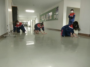先週の教室に続いて今日は廊下にワックスをかけました。