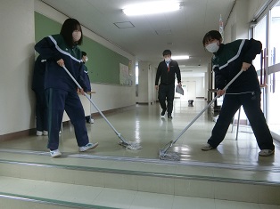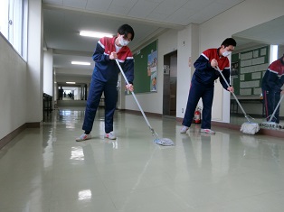 山梨県立山梨高等学校 > 学校から > 廊下ワックスがけ 2022年3月24日カテゴリー: 学校から 廊下ワックスがけ 先週の教室に続いて今日は廊下にワックスをかけました。 雑巾がけをして汚れを落とした後、ムラが出ないようにワックスの量を調整しながら丁寧に塗っていきました。 すぐに乾いてツヤが出てきてきれいになりました。 滑りが良くなったので注意してください。