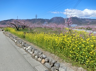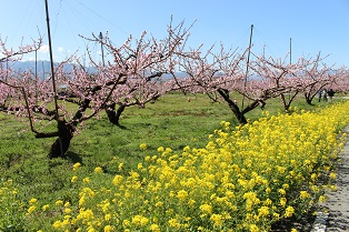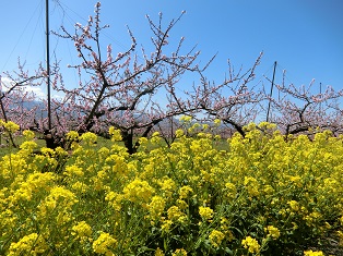 山梨県立山梨高等学校 > 学校から > 桃の花と菜の花 2022年4月5日カテゴリー: 学校から 桃の花と菜の花 桜は満開を過ぎましたが、学校近くの「かのがわ広場」付近の桃畑では桃の花が見頃を迎えています。 桃色と菜の花の黄色と空の青色のコントラストが映えています。