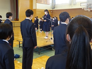 始めに生徒会長の風間さんから新入生に「分からないことがあったらいつでも声をかけて」と温かい歓迎の言葉が贈られました。
