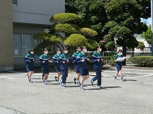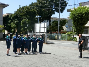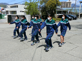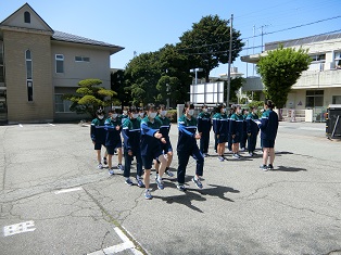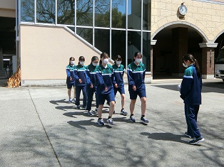 体育の授業で毎年4月に行っている集団行動の練習を校舎前で行いました。