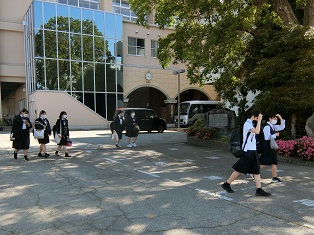 山梨県立山梨高等学校 > 学校から > 更衣移行期間 2022年5月23日カテゴリー: 学校から 更衣移行期間 1週間がスタートしました。今日は朝から良い天気で気温も上がる予報が出ています。 6月1日の夏服への更衣を前に現在は移行期間です。 ブレザー、やネクタイ、リボン無しのパターン、また2、3年生はポロシャツで登校する生徒も増えて来ました。