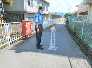 以前からある道路標識に加えて日下部警察署員さんが新たに道路中央に表示を設置しました。