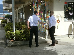 園児たちのかわいい願い事を近くで見せていただき、校長先生が七夕の説明をすると学校に戻り早速短冊に願い事を書きました。