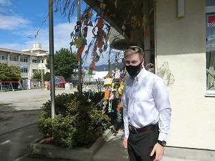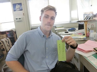 ALTのネイソン先生が梨高前のつつじ幼稚園の七夕飾りに興味を持ちました。