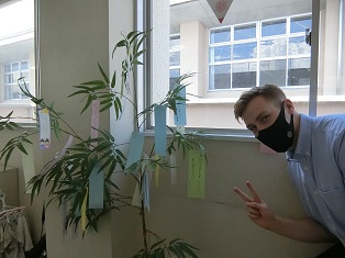 山梨県立山梨高等学校 > 学校から > 七夕飾り 2022年7月7日カテゴリー: 学校から 七夕飾り ALTのネイソン先生が梨高前のつつじ幼稚園の七夕飾りに興味を持ちました。 園児たちのかわいい願い事を近くで見せていただき、校長先生が七夕の説明をすると学校に戻り早速短冊に願い事を書きました。 校内でも笹の葉を飾っているクラスがあったので短冊を付けさせてもらいました。 すでにたくさんの願い事が書いてありましたが、ネイソン先生の願い事が一番真面目なものでした。