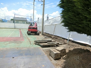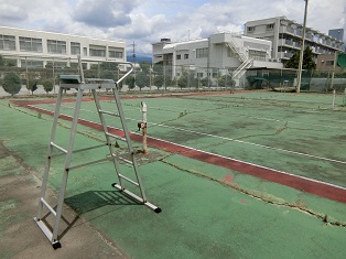 校舎東側のテニスコートがコンクリートの老朽化で表面に亀裂が入り使用できなくなったため、改修工事が始まりました。