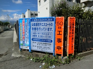 山梨県立山梨高等学校 > 学校から > テニスコート改修工事 2022年7月13日カテゴリー: 学校から テニスコート改修工事 校舎東側のテニスコートがコンクリートの老朽化で表面に亀裂が入り使用できなくなったため、改修工事が始まりました。 表面のコンクリートをはがす工事をおこない、多目的のグラウンドになります。