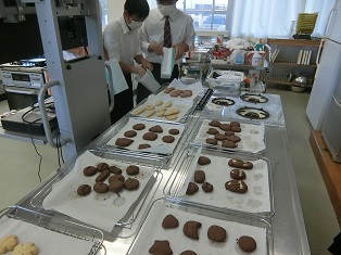 山梨県立山梨高等学校 > 学校から > 1年生調理実習 2022年10月21日カテゴリー: 学校から 1年生調理実習 1年生の家庭基礎の調理実習で沖縄の伝統的なお菓子「ちんすこう」を作りました。 バターや牛乳などの乳製品が入っていないシンプルな味と形状で地味な存在です。 今回はハロウィンにも使えるかわいい?「ちんすこう」にチャレンジした生徒がいました。 ココアパウダーや紅芋パウダーも入れてみました。 オーブンから取り出してみると、成功したようにも見えましたが、焼き上がりを見るといたるところに亀裂が入っていました。持ち上げようとしたところ分解してしまい、残念ながら原型を維持することができませんでした。 しかし、偶然にもその1つひとつの破片がオリジナルのちんすこうの形になっていました。 やはり、ちんすこうのようなサクッとした食感のお菓子には適した形状があるようです。 みんなで楽しく作れてどれも美味しかったので満足していました。