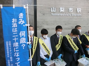 山梨県立山梨高等学校 > 学校から > 20歳未満飲酒防止キャンペーン 2022年10月27日カテゴリー: 学校から 20歳未満飲酒防止キャンペーン 10月27日(木)に山梨県小売酒販組合連合会主催の「20歳未満飲酒防止キャンペーン」が実施され、梨高生も5名参加しました。 山梨市駅では市長さん、酒販店や酒造店などの方々と共に「20歳未満飲酒防止」や「飲酒運転防止」を通学や通勤する人たちに呼びかけました。 社会全体で成長過程にある20歳未満の心身に悪影響を及ぼす飲酒を防止していかなければなりません。