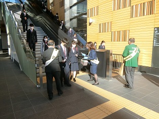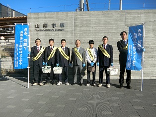 山梨市駅では市長さん、酒販店や酒造店などの方々と共に「20歳未満飲酒防止」や「飲酒運転防止」を通学や通勤する人たちに呼びかけました。
