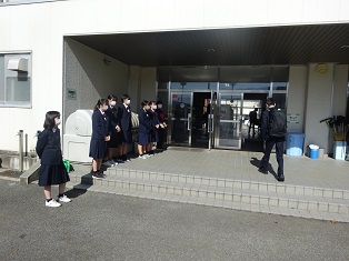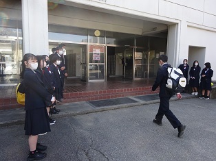 生徒昇降口では部活動や生徒会の生徒たちが登校してくる生徒に元気なあいさつを呼びかけています。