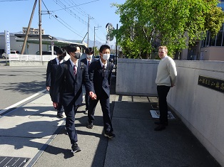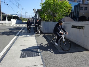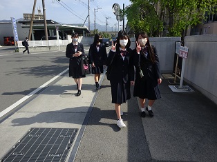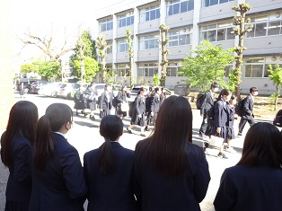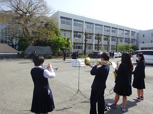 吹奏楽部は校門前で校歌などを演奏して朝の雰囲気を盛り上げています。