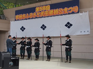 山梨県立山梨高等学校 > 学校から > 甲州市ふるさと「武田勝頼公まつり」 2023年4月24日カテゴリー: 学校から 甲州市ふるさと「武田勝頼公まつり」 4月23日(日)に旧大和中学校校庭で行われた甲州市ふるさと「武田勝頼公まつり」に7名の生徒が軍団の槍武者と鉄砲隊として参加しました。 今回は祭りのメインイベントとなる出陣絵巻の中で殺陣を行う配役をいただき、専門家の方から槍や鉄砲の演技指導を受けました。 また、軍団出陣前に景徳院で行われた法要と祈願式に参加しました。 本番では練習通り迫力ある演技を披露することができ、会場を盛り上げました。 朝から大変な一日でしたが、貴重な体験や、にぎやかなお祭りの雰囲気を味わうことができ、みんなが楽しむことができました。