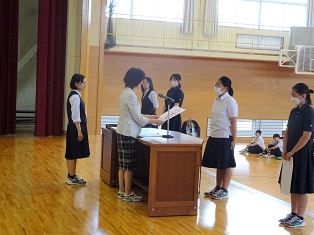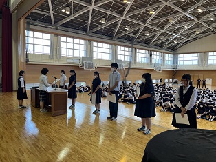 その後納め式を行い、女子卓球部、女子ハンドボール部、陸上競技部、写真部の生徒が賞状を納めました。