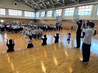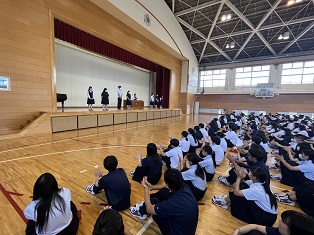 続いて、夏の高校野球山梨大会に出場する野球部と全国高等学校総合文化祭に出場する写真部3年橘田さんの壮行会を行い、全校生徒でエールを送りました。