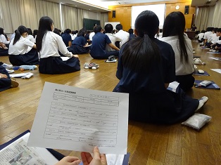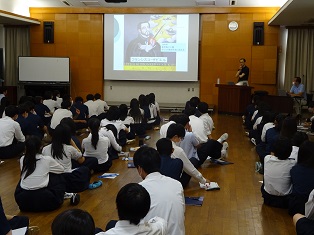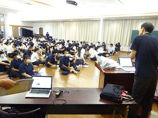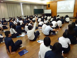 山梨県立山梨高等学校 > 学校から > 修学旅行事前学習① 2023年9月14日カテゴリー: 学校から 修学旅行事前学習① 2年生は11月に3泊4日で九州への修学旅行が実施されます。 2学期になり準備も本格化し、現在はコース別行動の検討を行なっています。 13日(水)に長崎市東京事務所の山田さんが班別コースとなる長崎の歴史や観光名所など見どころをクイズを交えながら説明してくれました。 また、旅行会社の担当者からは福岡県から熊本県への個人別コースの概要を説明してもらいました。 歴史の中で外国に影響を受けた独特の文化に触れたり、被爆地となった地で戦争と平和を考える良い機会になると思われます。