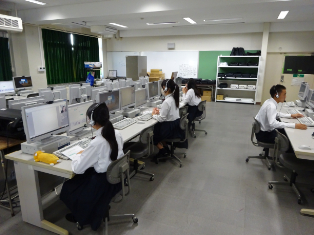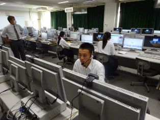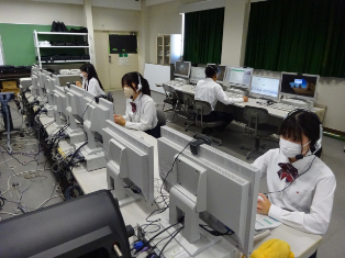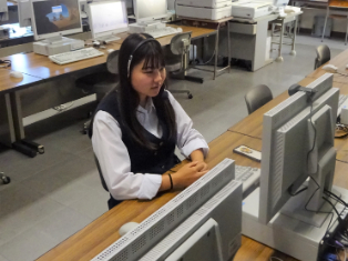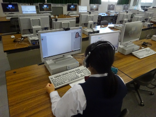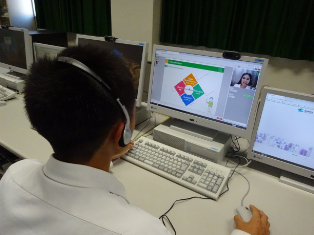 コンピュータ室でフィリピンの外国人講師と生徒各自がマンツーマンで英会話をします。