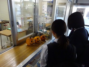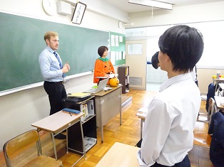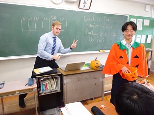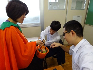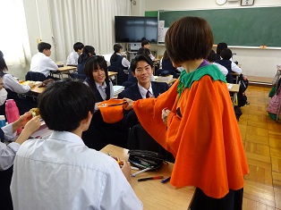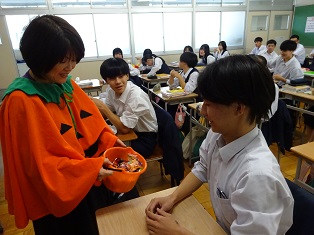英語の授業では魔法使いに仮装した生徒と先生がお菓子を配りました。