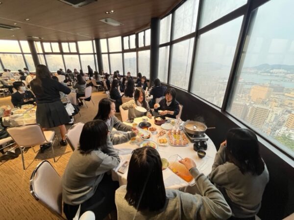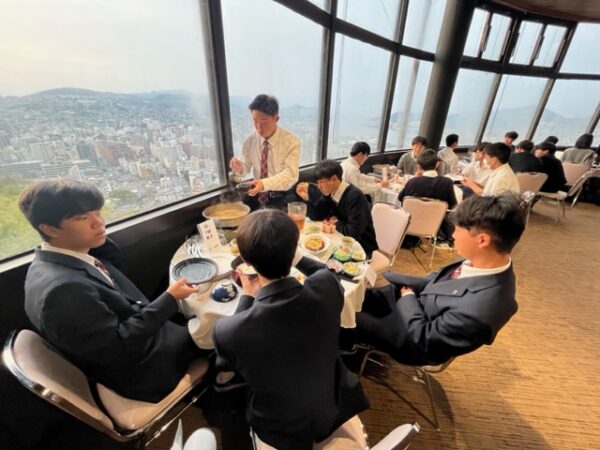 山梨県立山梨高等学校 > 学校から > 修学旅行3日目開始 2023年11月16日カテゴリー: 学校から 修学旅行3日目開始 修学旅行も後半、3日目になりました。 長崎市内を一望しながら朝食を食べました。 今日は、これから3つの希望コースに分かれて見学します。