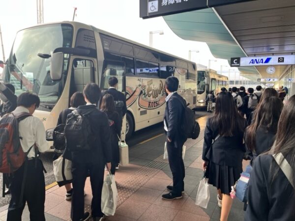 山梨県立山梨高等学校 > 学校から > 修学旅行最終日④ 2023年11月17日カテゴリー: 学校から 修学旅行最終日④ 羽田空港に到着しました。 飛行機が予定時刻より少し遅れました。 バスに乗り換えて15時30分に山梨に向かい出発しました。 途中談合坂SAで、トイレ休憩の予定です。 そこで到着予定時刻をあらためて生徒から連絡する予定です。 到着場所は、山梨市役所旧庁舎跡です。