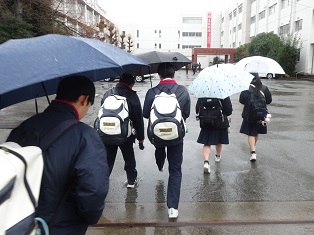 山梨県立山梨高等学校 > 学校から > 雨天の登校 2024年2月22日カテゴリー: 学校から 雨天の登校 今日は朝から雨が降っていて、大きな水たまりができています。 ほとんどの生徒が傘をさして登校しています。 その中で「ネコ柄」の傘をさしている生徒を見つけました。 今日2月22日の「猫の日」にマッチしていてイイネです。